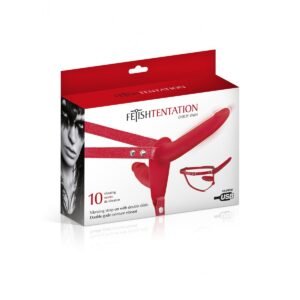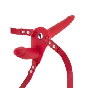 Arnés doble realizado en silicona ajustable con vibración recargable mediante cable USB.