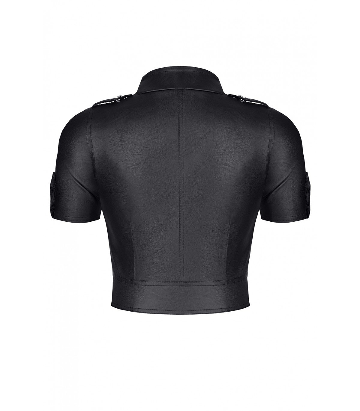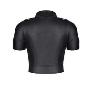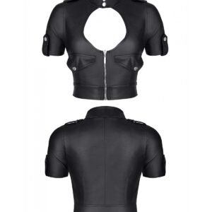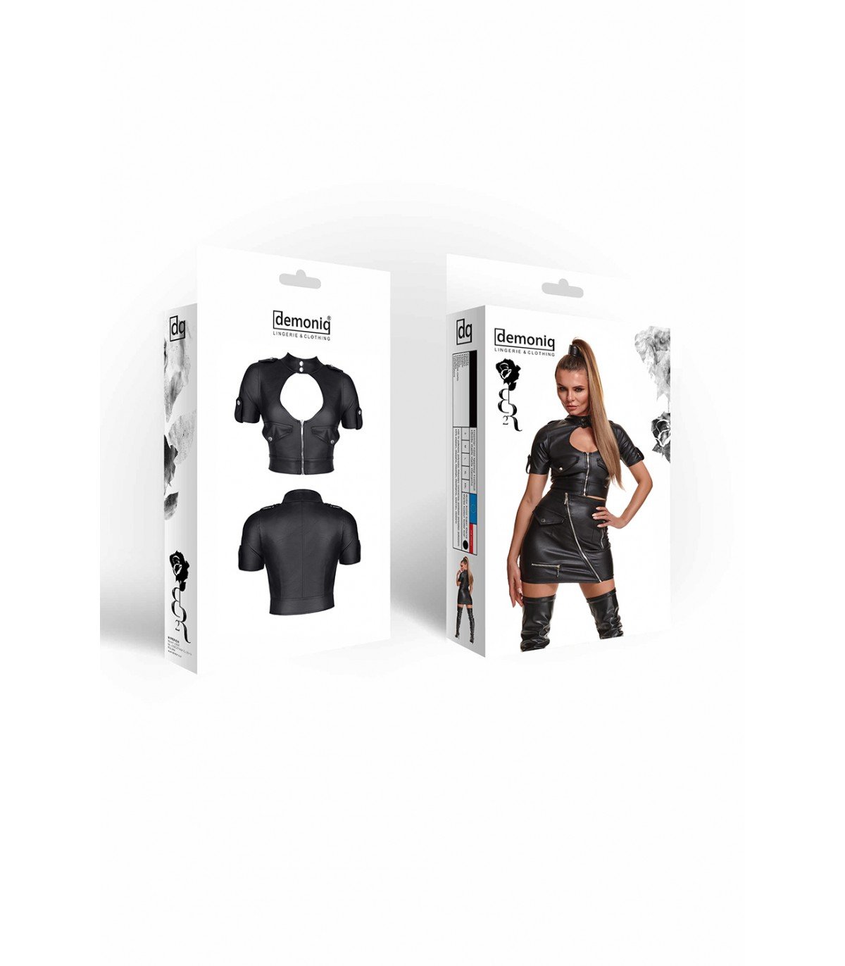 Un top inspirado en el estilo militar. Fabricada en ecopiel duradera y flexible. Sus características hacen que se ajuste perfectamente al cuerpo, resaltando su forma. El escote redondo es excepcionalmente espectacular. La parte inferior presenta una cremallera decorativa plateada con el logo de demoniq grabado. El carácter militar se acentúa con la silueta y las charreteras en los hombros, adornadas con botones automáticos plateados.