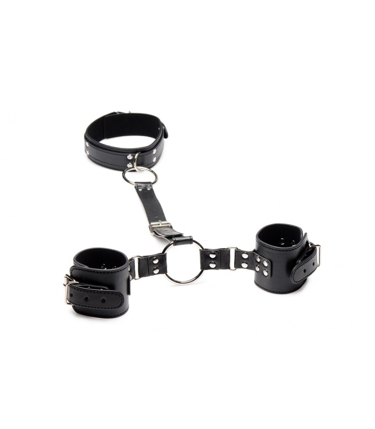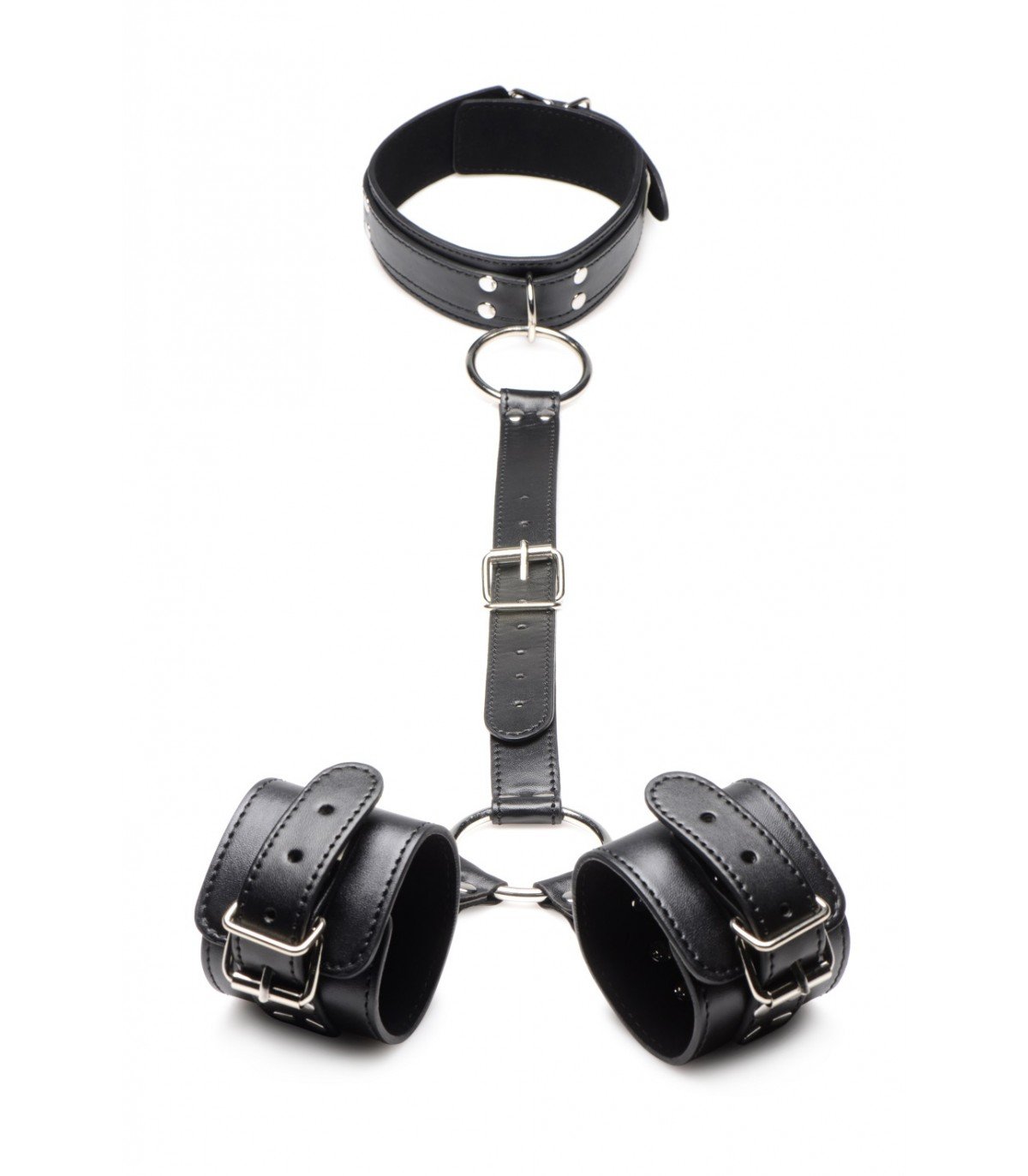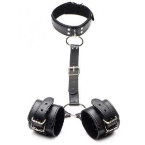 Engancha tus dedos alrededor de las juntas tóricas y tira de tu amante hacia ti. Juega colocando las juntas tóricas en diferentes puntos de anclaje o aleja las manos de ellos. Sus muñecas estarán esposadas y restringidas, la correa central unida a su cuello con collar. Mantenga la correa central corta para mantener sus manos fuera del alcance de sus genitales para que no puedan jugar consigo mismos y disfrutar de las burlas y los juegos con ellos. Limite su movimiento aún más llevando la correa hacia atrás y colocando las muñecas sujetas detrás de la espalda.