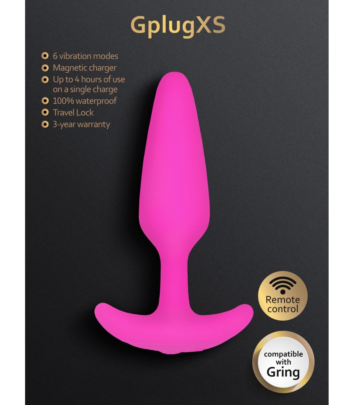 ¡El tapón anal más pequeño con un motor en el control remoto! El diámetro del enchufe XS es ​​de solo 2 cm/0,78 pulgadas. ¡Ideal para principiantes! La principal ventaja de Gplug XS es ​​un tapón estrecho anatómicamente cómodo. Esto hace que el Gplug XS sea cómodo para un uso a largo plazo.