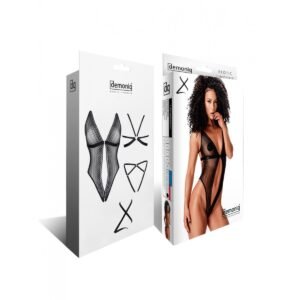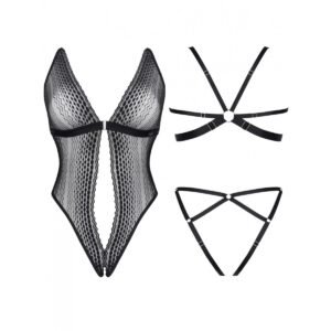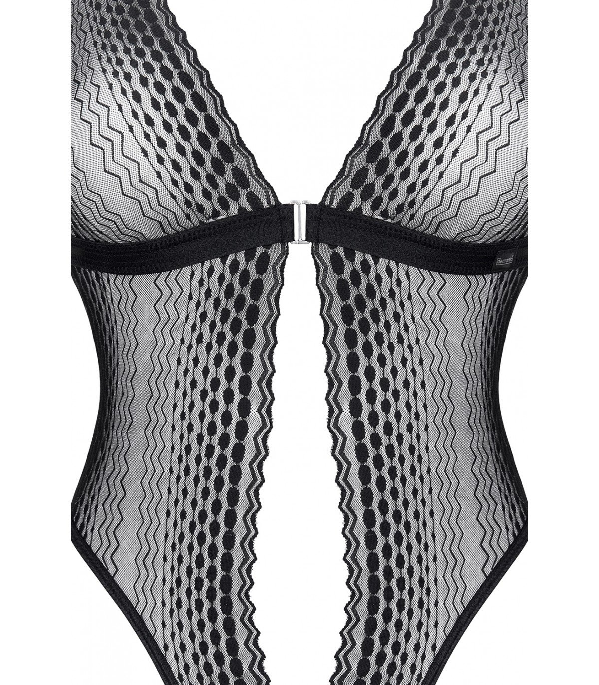 Body agradable al tacto, de encaje negro con motivos geométricos verticales. Llamativo corte vertical en la parte delantera. En la parte posterior hay una atractiva composición de bandas elásticas con una rueda de metal plateada y reguladores de metal plateado. Gracias a numerosos reguladores, el juego se puede adaptar perfectamente al cuerpo.