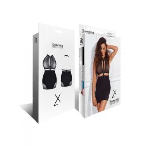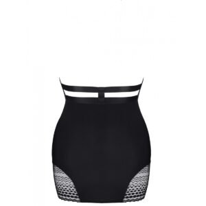 El vestido está lleno de erotismo sutil y sensual, tiene un escote espectacular hecho del característico encaje negro con patrón geométrico. Armoniza maravillosamente con la composición de bandas elásticas negras decoradas con un anillo de metal plateado. También hay un anillo plateado, Ajustador de metal en la parte posterior del cuello.