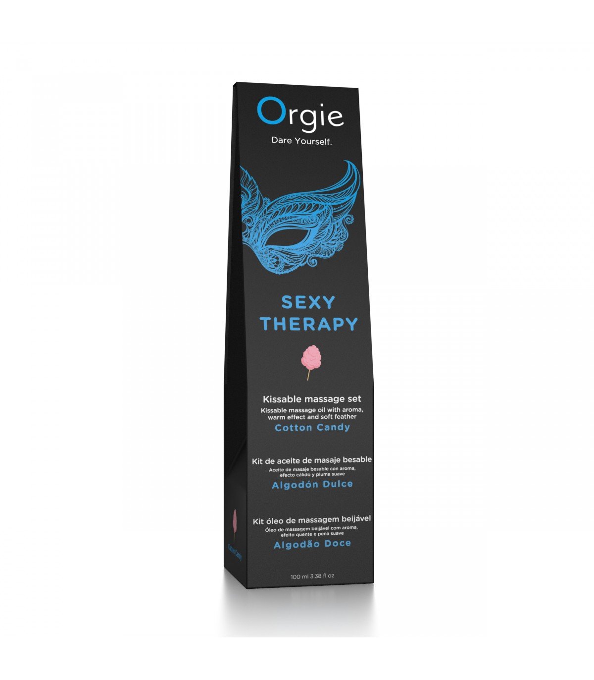 Sexy Therapy Kissable Massage Set para realizar el Masaje de Labios, una excitante experiencia sensorial una excitante experiencia sensual por la preliminares. El set contiene 01 Aceite de Masaje Besable Terapia Sexy con efecto calor y delicioso sabor a Algodón de Azúcar, 01 Pluma, 01 Guía de Masaje de Labios.