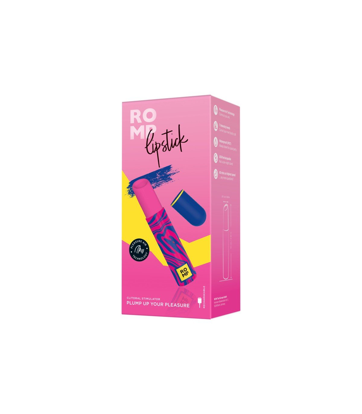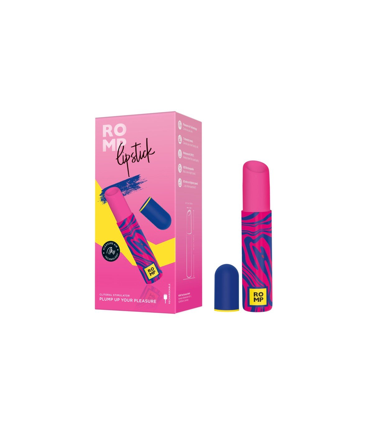 Succionador con forma de pintalabios. Gracias a ser recargable, tiene una gran potencia de succión
