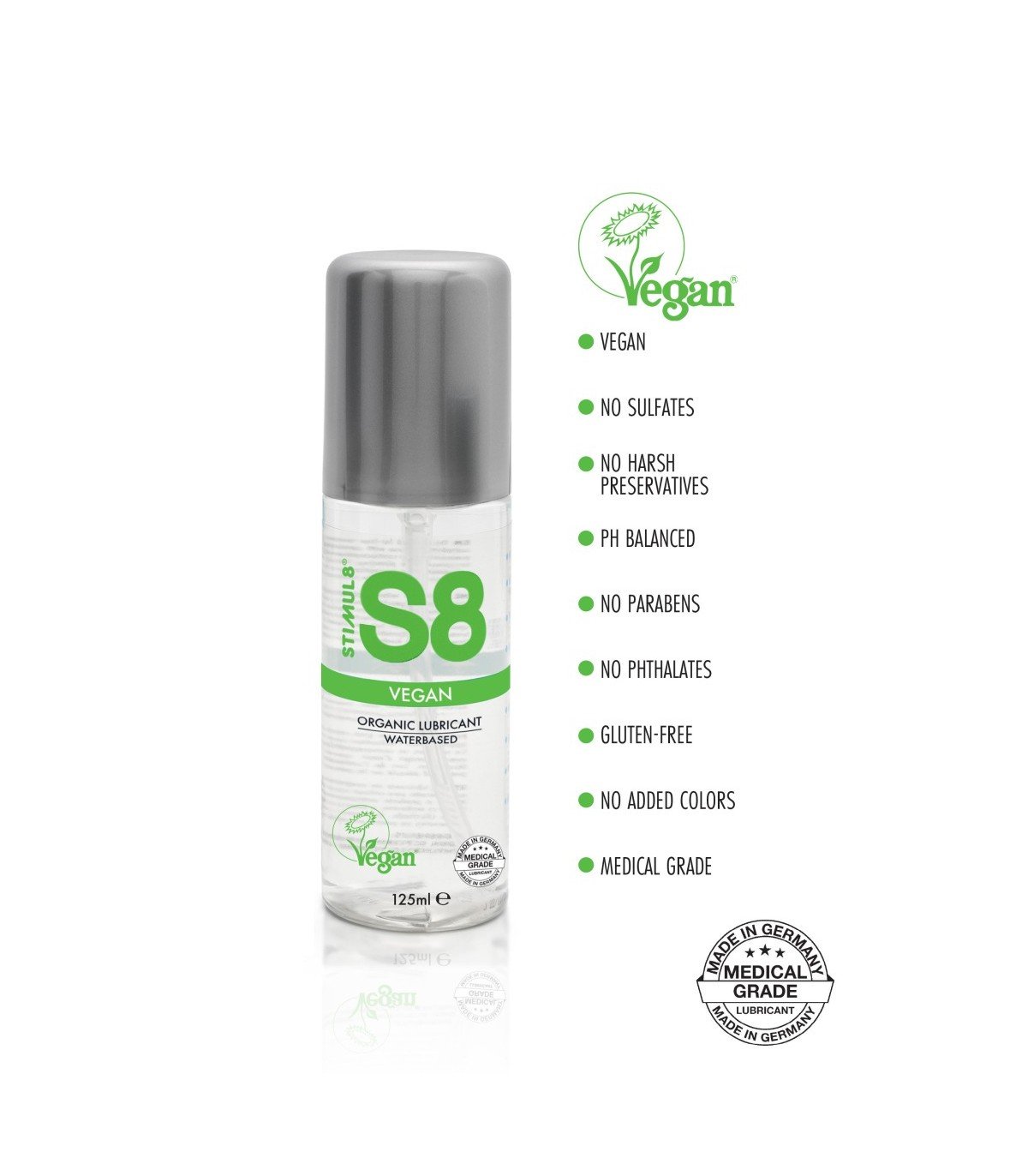 El lubricante vegano a base de agua premium de S8 es una combinación perfecta para los consumidores que buscan un lubricante de calidad y seguro para el cuerpo para mejorar la intimidad y suavizar sus aventuras placenteras. Esta increíble fórmula de larga duración de S8 es completamente vegana, lo que la convierte en una opción tanto para la salud como para el medio ambiente en la lubricación íntima. La fórmula también es libre de parabenos, ftalatos, gluten, sulfatos, además no contiene colorantes ni conservantes agresivos para un atractivo «natural» irresistible. Con aprobación de grado médico, el lubricante vegano a base de agua S8 también se adhiere a todas las regulaciones actuales de la UE con respecto a los productos para el cuidado íntimo y es una alternativa confiable, de precio competitivo y transparente a otras opciones veganas no aprobadas en el mercado.