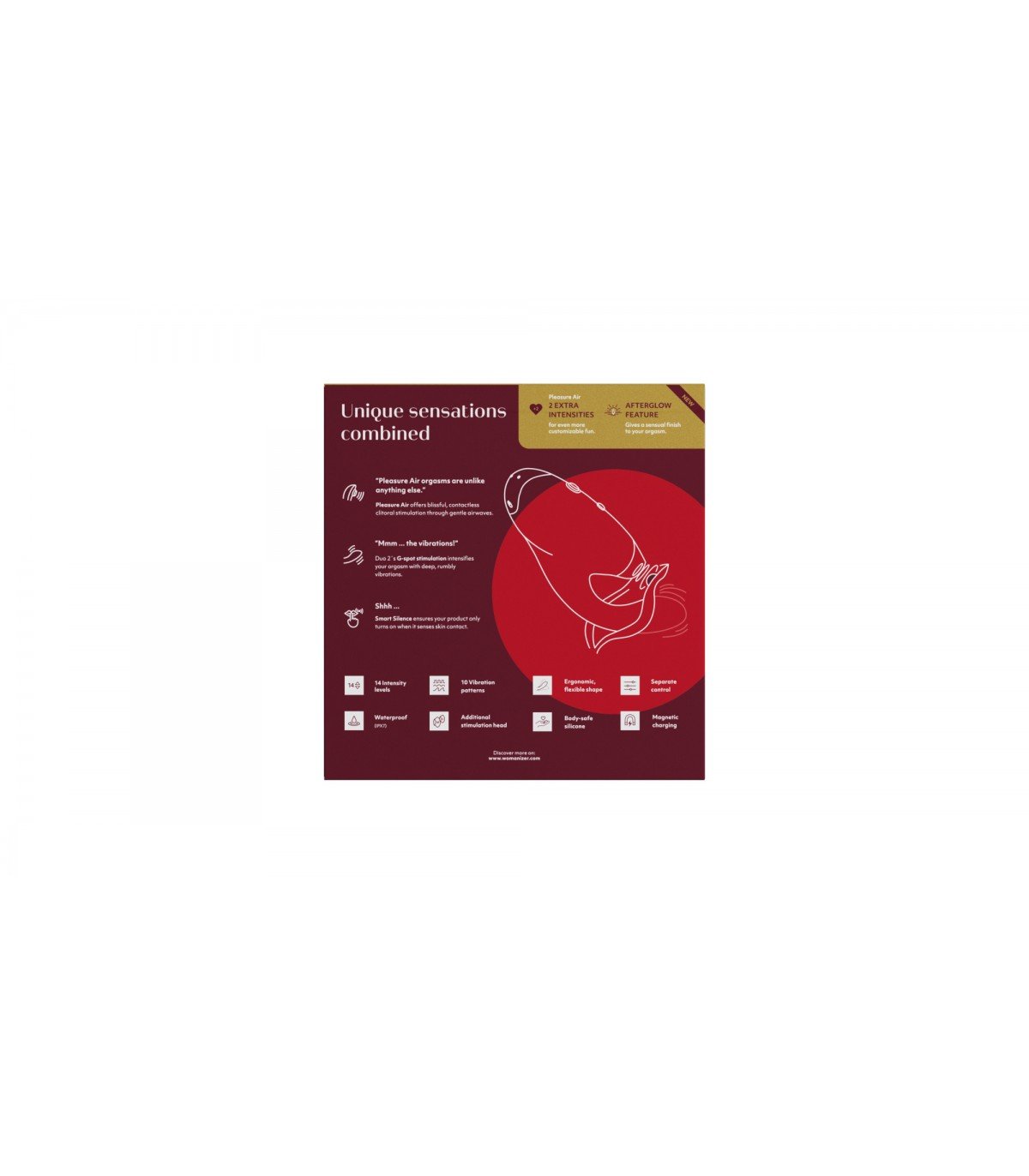 – Pleasure Air Technology: brinda un equilibrio perfecto entre cambios pulsantes y masajeadores de air pressure sin contacto con el clítoris. Esto garantiza que las aproximadamente 8000 terminaciones nerviosas no lleguen nunca a sobreestimularse para proporcionar un nuevo tipo de orgasmo extraordinario.