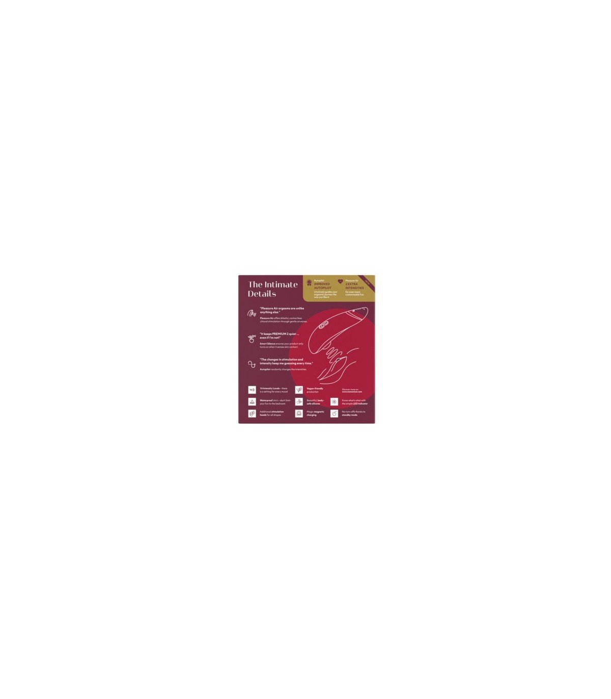 El Womanizer PREMIUM 2 con la original Pleasure Air Technology es nuestra creación más lujosa hasta la fecha. Es el Prada de los juguetes sexuales, el juguete definitivo para las mujeres que quieren algo más que otro dispositivo con el que jugar. Con más niveles de intensidad que nunca y una función Autopilot mejorada para acompañarte en aventuras nuevas e impredecibles, el PREMIUM 2 es el placer más puro con la máxima calidad.