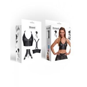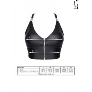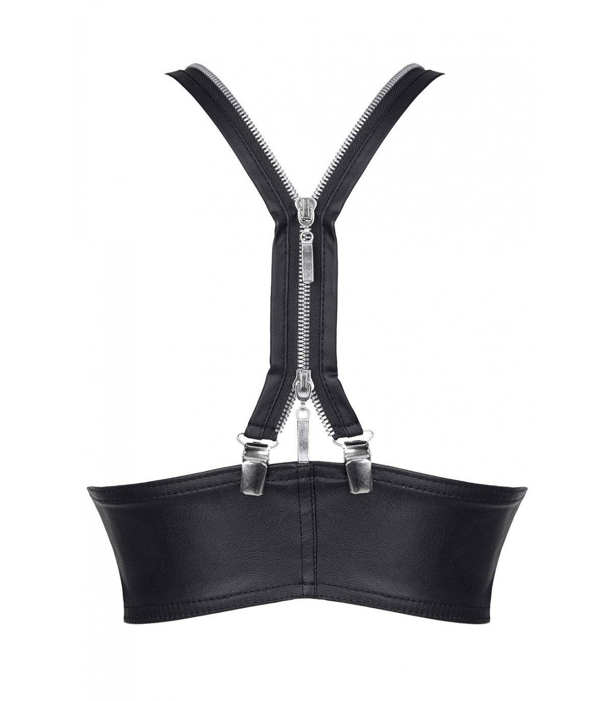 Top corto con copas perfiladas. La parte delantera tiene un escote llamativo y una cremallera decorativa. Tirantes desmontables, por su diseño son muy singulares y de aspecto moderno. Están hechos de cierres decorativos y cremallera, que también es decorativa y sirve para ajustar la longitud de los tirantes. La parte superior está realizada íntegramente en ecopiel elástica negra con textura de piel auténtica. Es agradable al tacto y se adapta perfectamente al cuerpo.